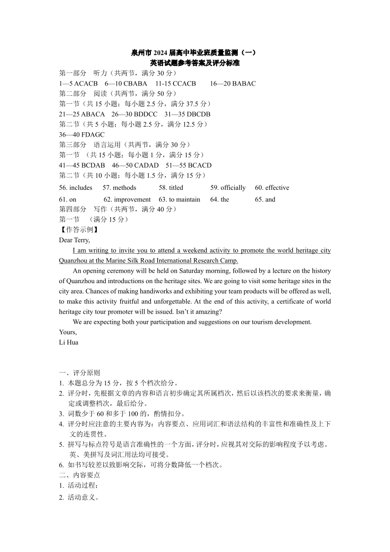 福建省泉州市2024届高三质量检测(一)英语答案