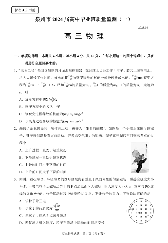 福建省泉州市2024届高三质量检测(一)物理
