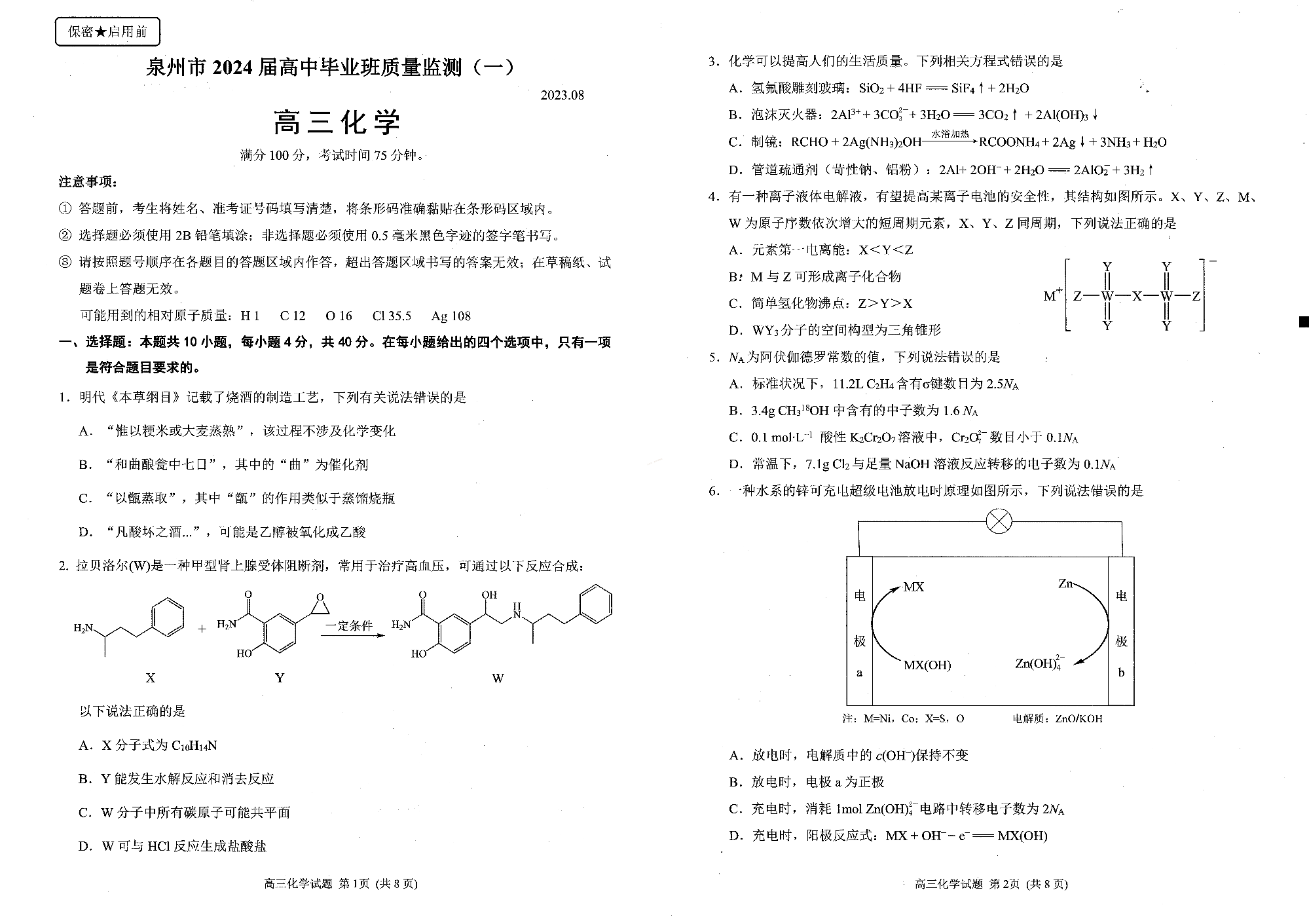 福建省泉州市2024届高三质量检测(一)化学