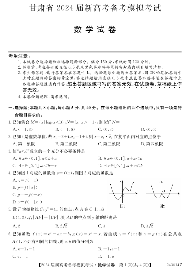 甘肃省 2024 届新高考开学模拟考试数学