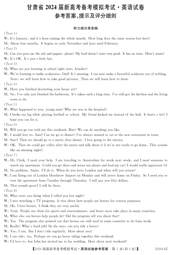 甘肃省 2024 届新高考开学模拟考试英语答案