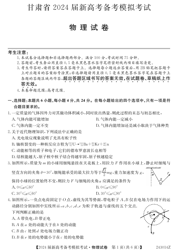 甘肃省 2024 届新高考开学模拟考试物理