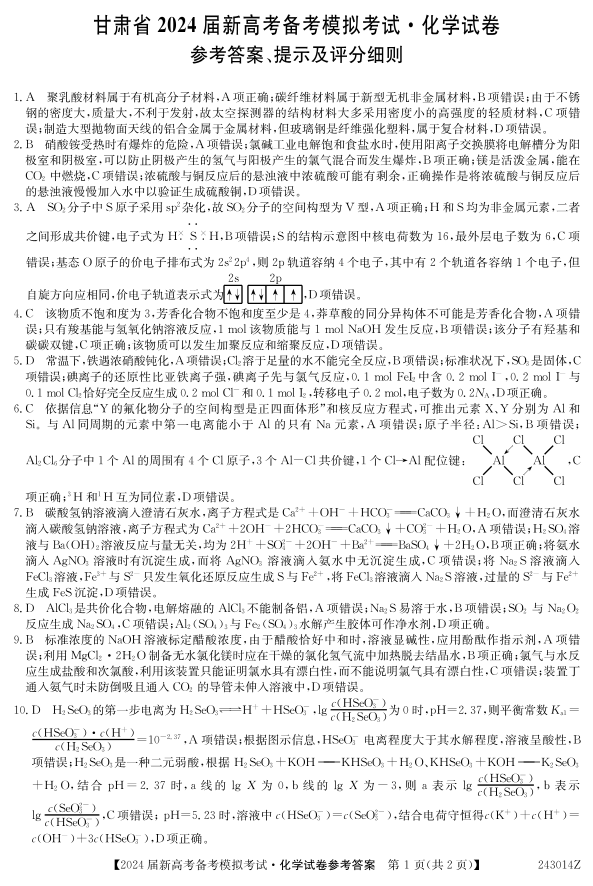 甘肃省 2024 届新高考开学模拟考试化学答案