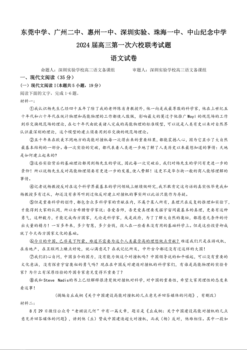 广东省六校2024届高三上学期第一次联考语文+答案