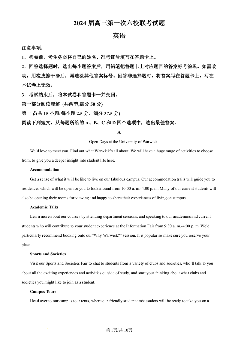 广东省六校2024届高三上学期第一次联考英语(原卷版)