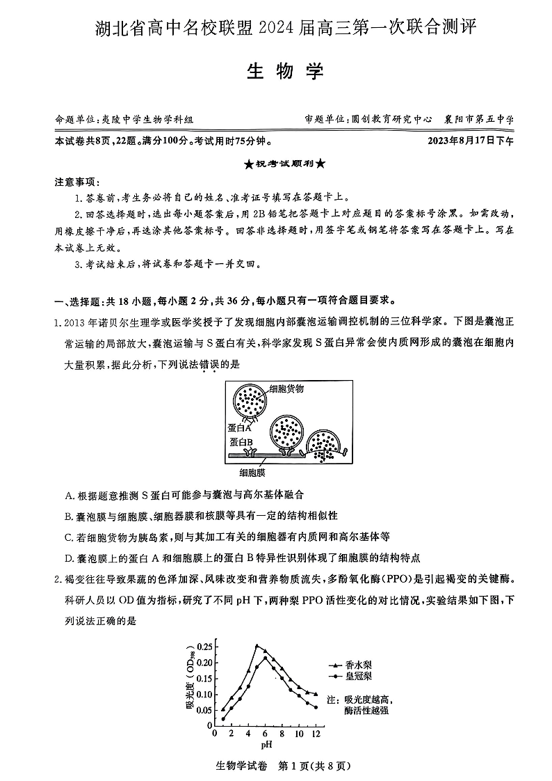 广东省广州市部分学校2024届高三8月阶段训练生物