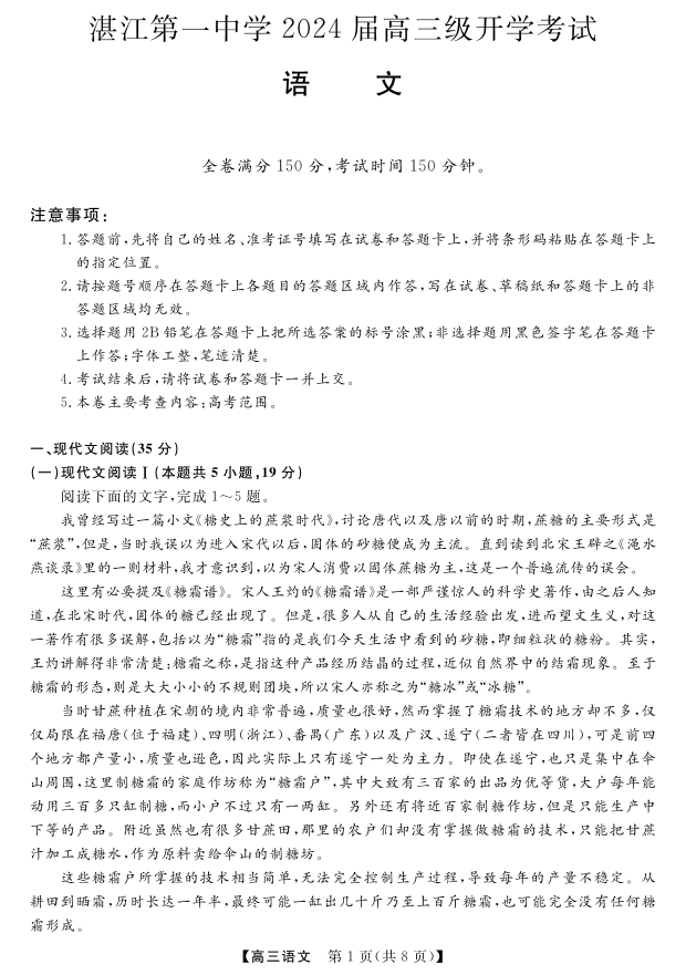 广东省茂名湛江市第一中学2024届高三上学期开学考语文