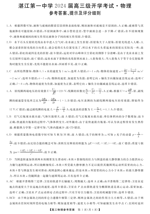 广东省茂名湛江市第一中学2024届高三上学期开学考物理答案