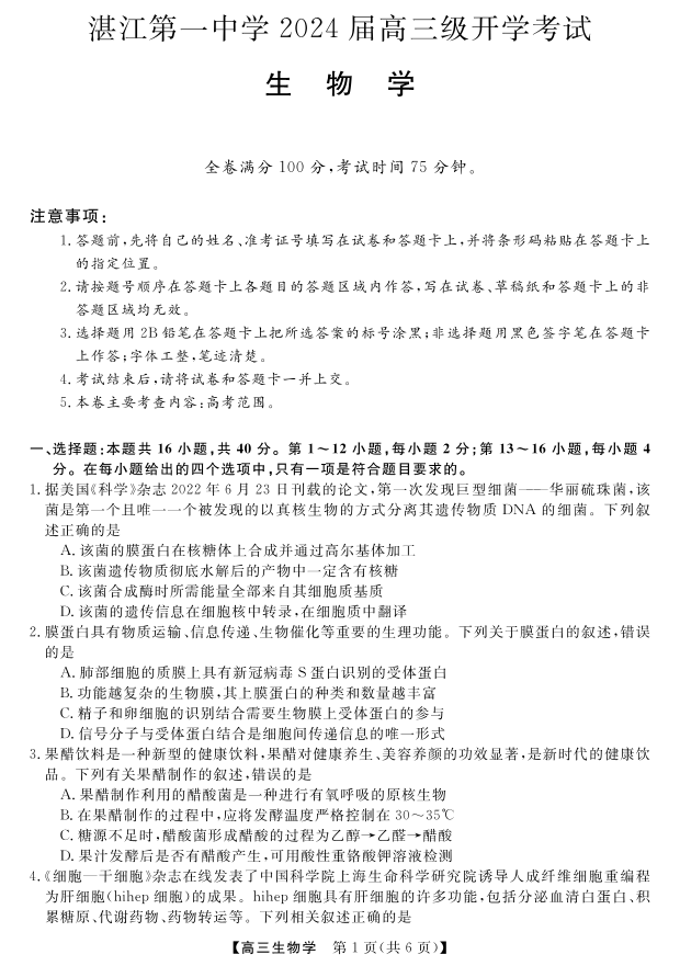 广东省茂名湛江市第一中学2024届高三上学期开学考生物