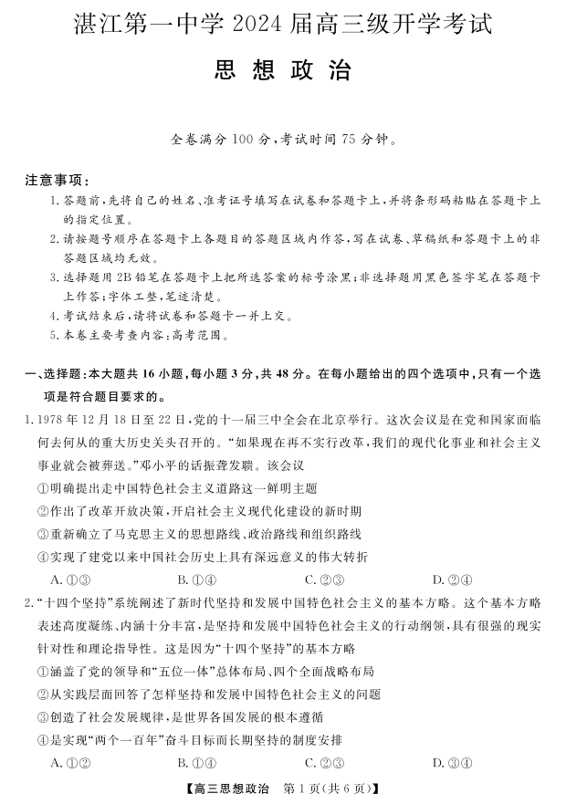 广东省茂名湛江市第一中学2024届高三上学期开学考政治