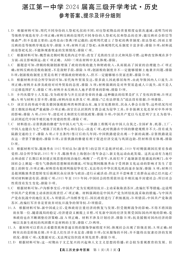 广东省茂名湛江市第一中学2024届高三上学期开学考历史答案