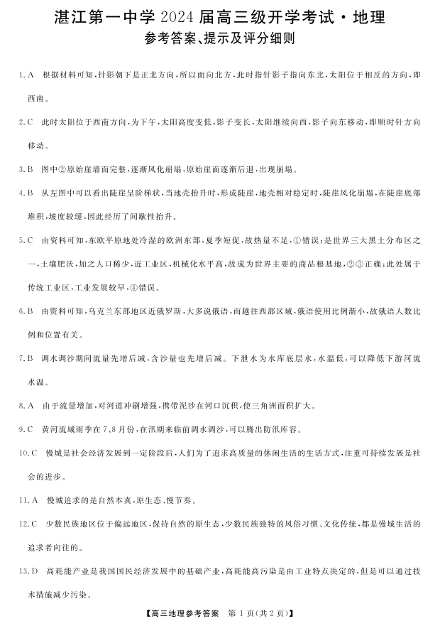广东省茂名湛江市第一中学2024届高三上学期开学考地理答案