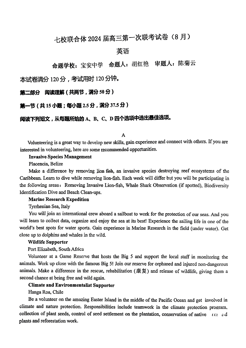 广东省七校2024届高三上学期第一次联考英语