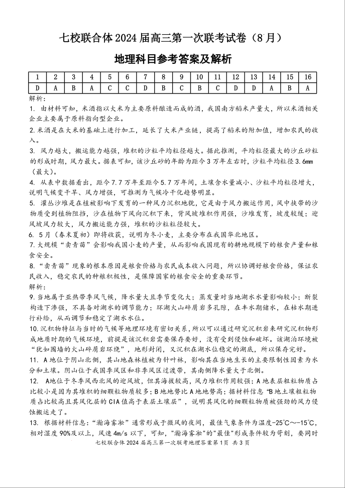 广东省七校2024届高三上学期第一次联考地理答案