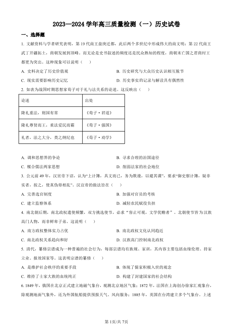 广东省深圳市罗湖区2024届高三上学期开学模拟考(质量检测一)历史