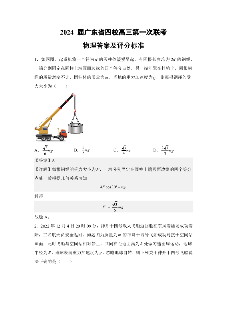 广东省四校2024届高三上学期第一次联考物理答案