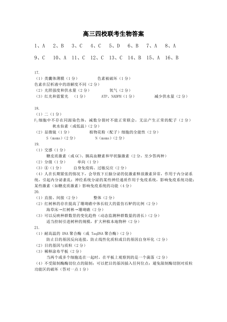 广东省四校2024届高三上学期第一次联考生物答案