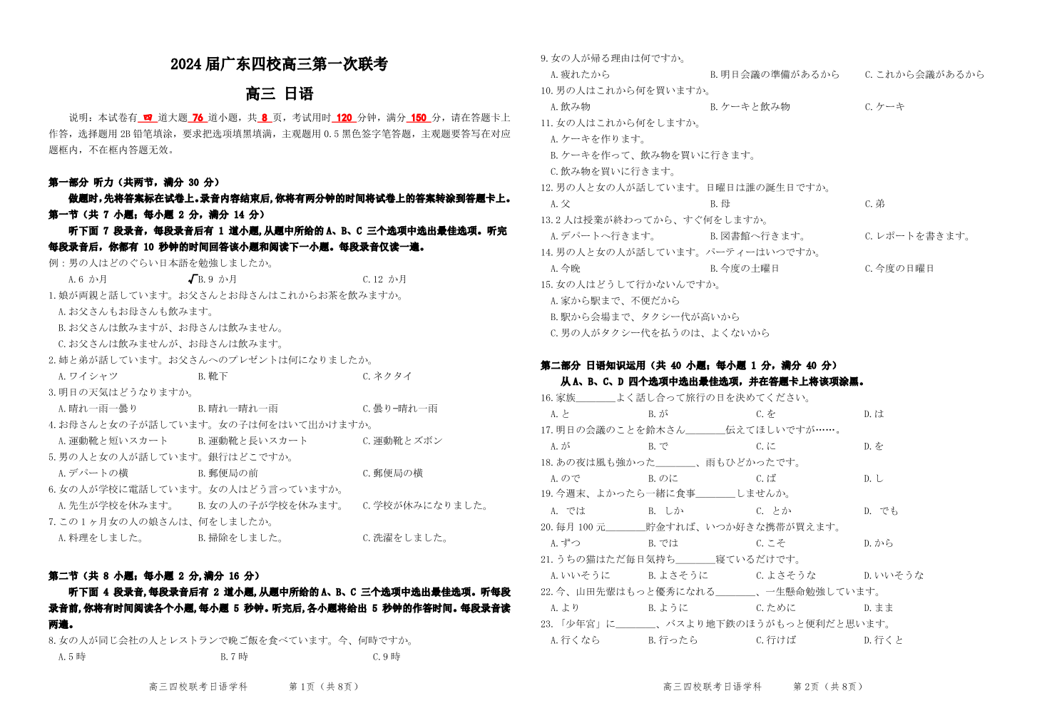 广东省四校2024届高三上学期第一次联考日语