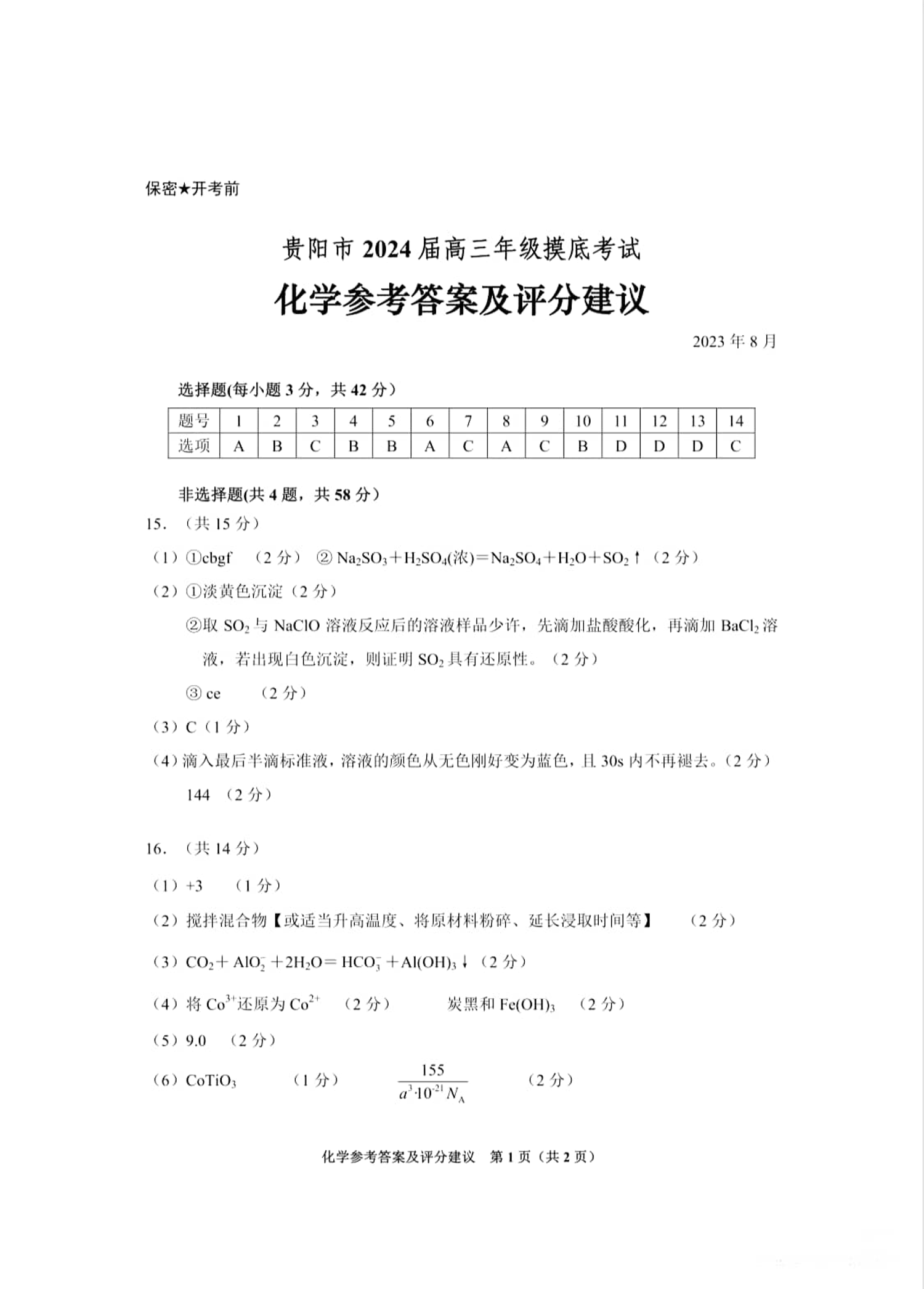 贵州省贵阳市2024届高三上学期开学考试化学答案