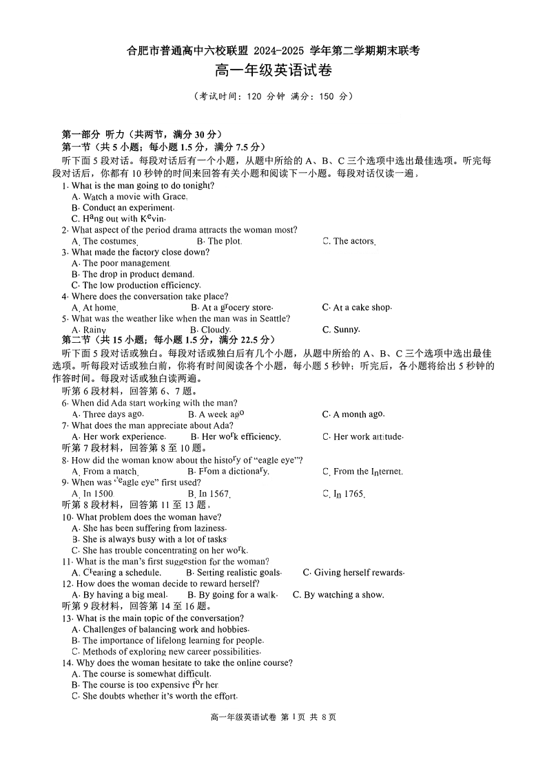 高一英语+答案--安徽省合肥市六校联盟 2024-2025 学年高一下学期期末联考