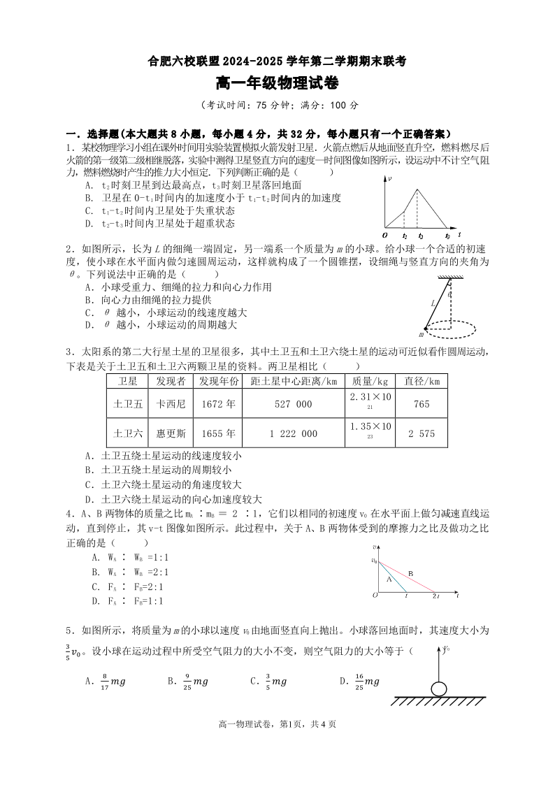 高一物理--安徽省合肥市六校联盟 2024-2025 学年高一下学期期末联考