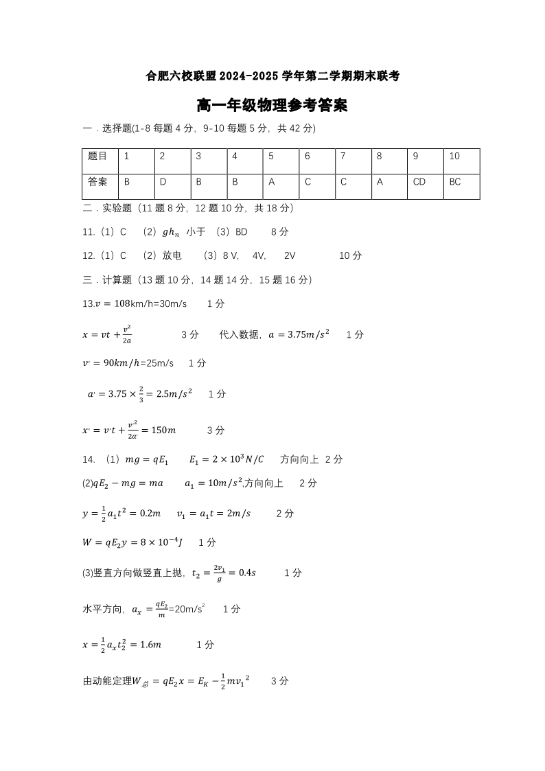 高一物理答案--安徽省合肥市六校联盟 2024-2025 学年高一下学期期末联考