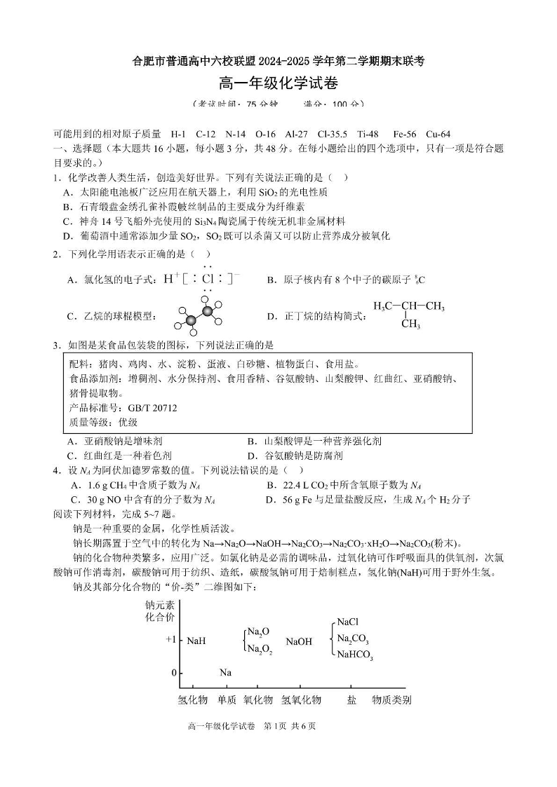 高一化学+答案--安徽省合肥市六校联盟 2024-2025 学年高一下学期期末联考