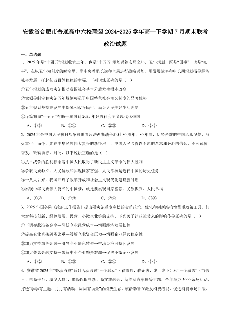 高一政治+答案--安徽省合肥市六校联盟 2024-2025 学年高一下学期期末联考
