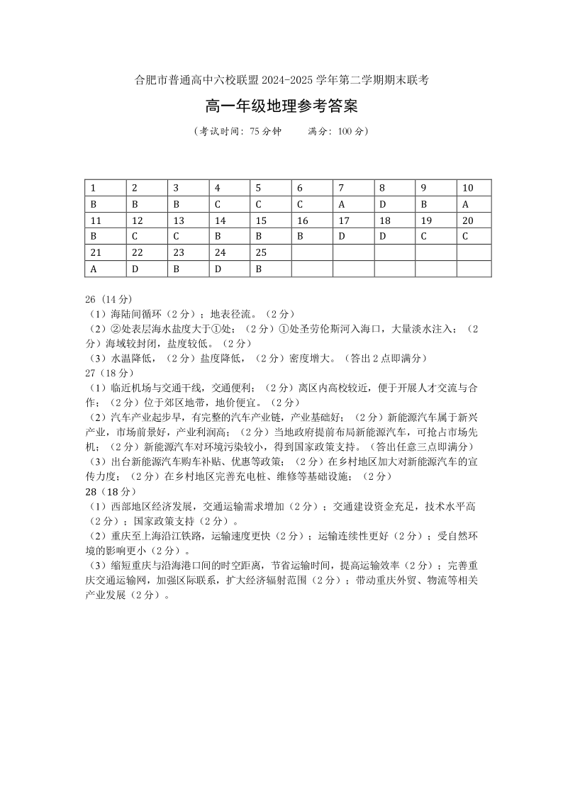 高一地理答案--安徽省合肥市六校联盟 2024-2025 学年高一下学期期末联考