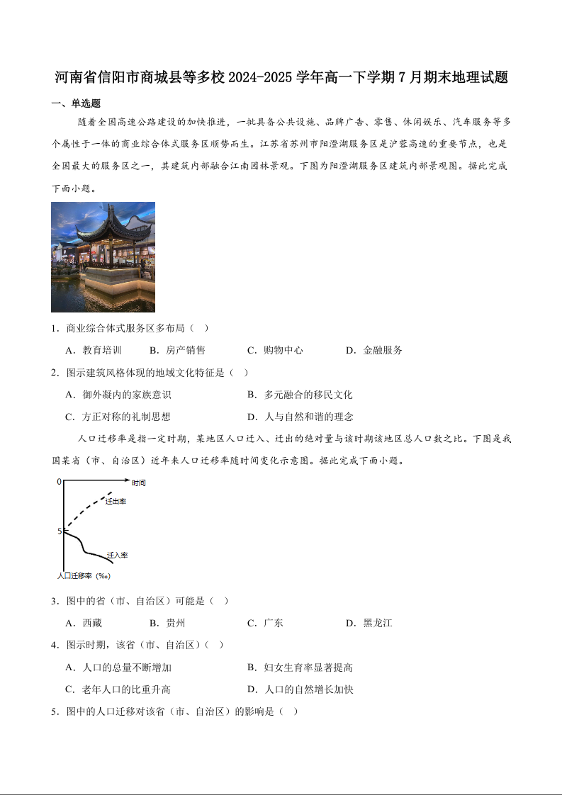 高一地理+答案--河南省信阳市商城县2024-2025学年高一下学期期末考试