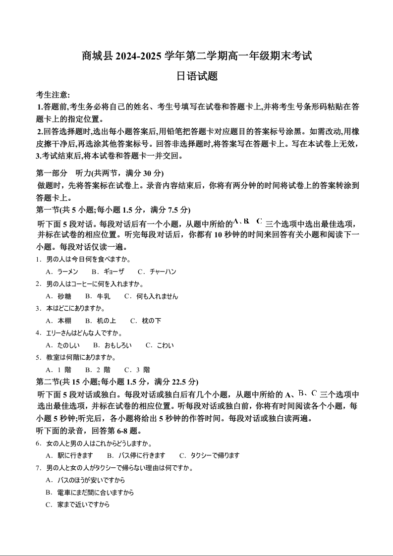 高一日语+答案--河南省信阳市商城县2024-2025学年高一下学期期末考试