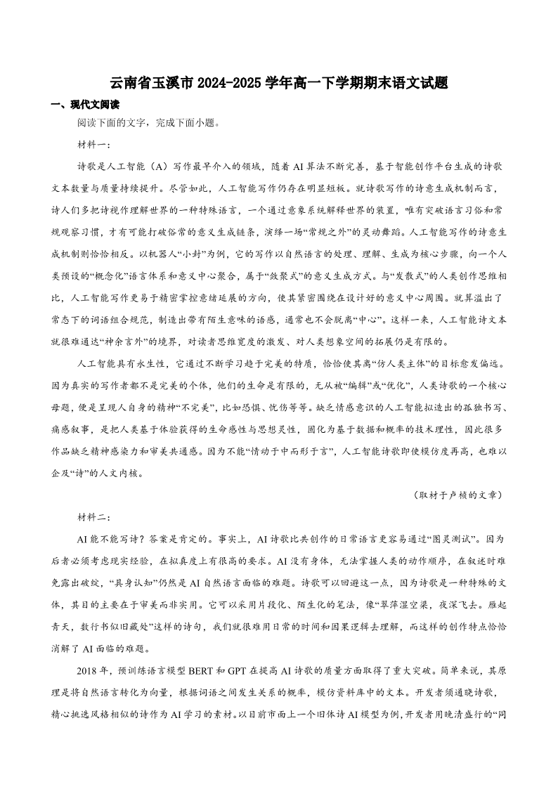 高一语文+答案--云南省玉溪市2024-2025学年高一下学期期末教学质量检测