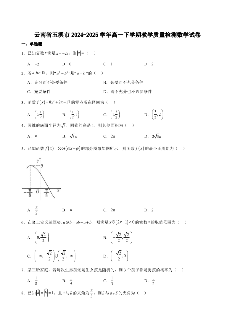 高一数学+答案--云南省玉溪市2024-2025学年高一下学期期末教学质量检测