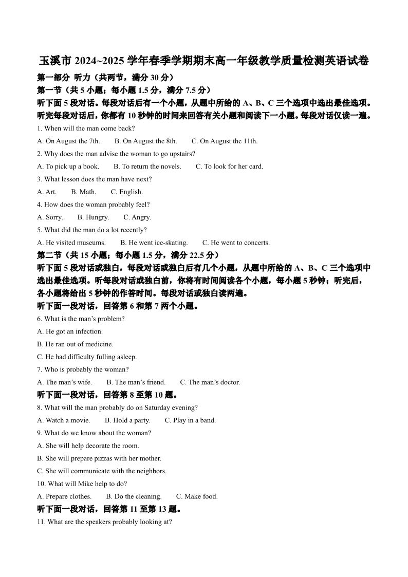 高一英语--云南省玉溪市2024-2025学年高一下学期期末教学质量检测