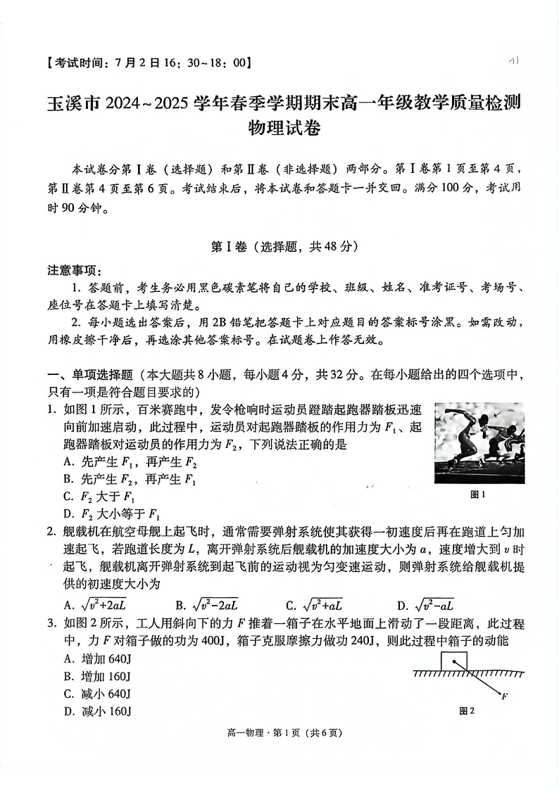 高一物理+答案--云南省玉溪市2024-2025学年高一下学期期末教学质量检测