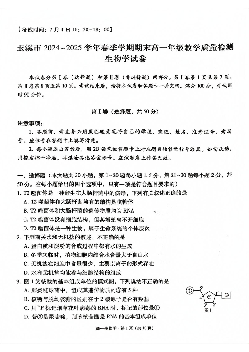 高一生物+答案--云南省玉溪市2024-2025学年高一下学期期末教学质量检测