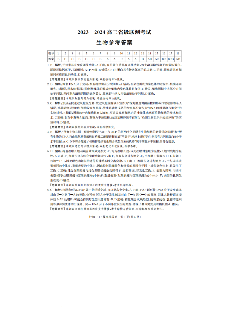 河北省2024届高三上学期省级联测考试生物答案