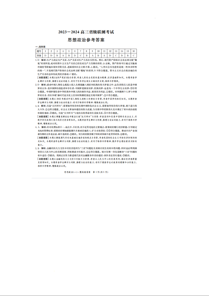 河北省2024届高三上学期省级联测考试政治答案