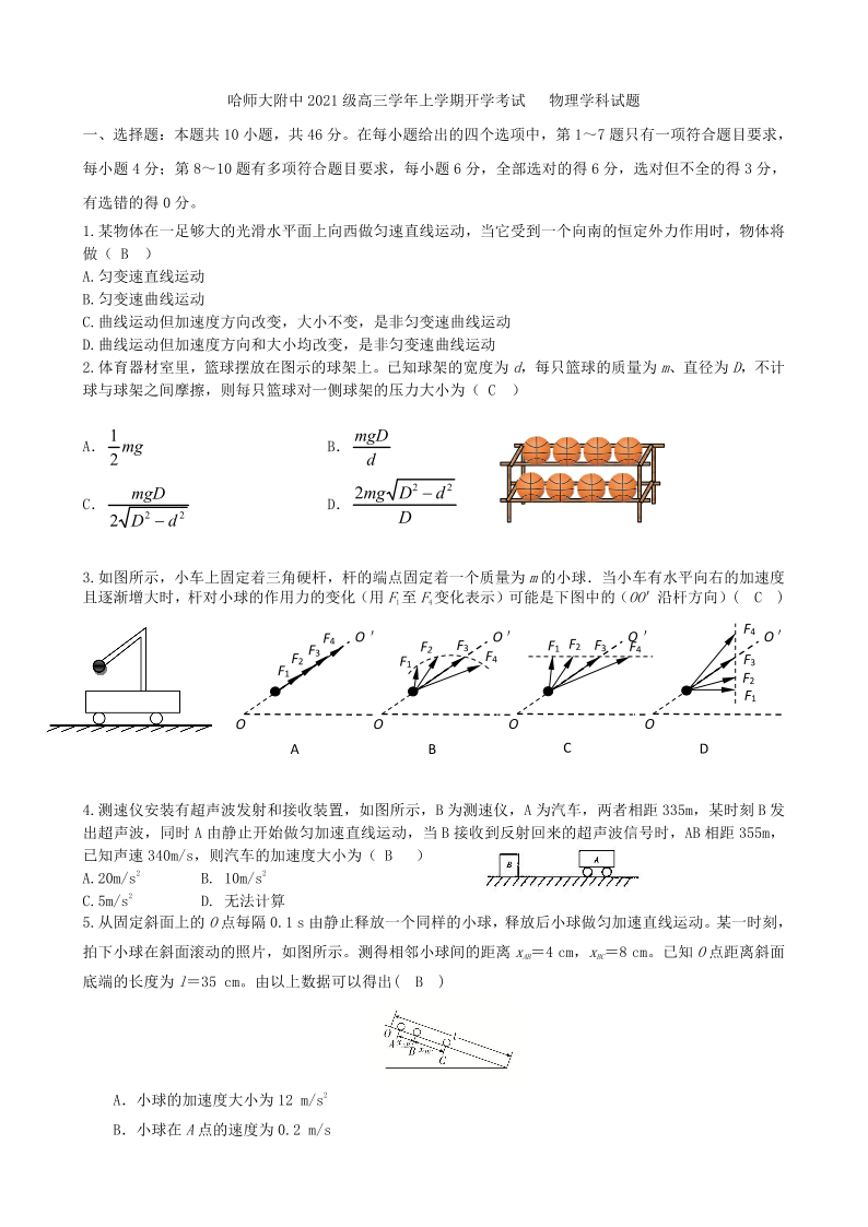 黑龙江省哈尔滨师范大学附属中学2024届高三上学期开学考试物理答案