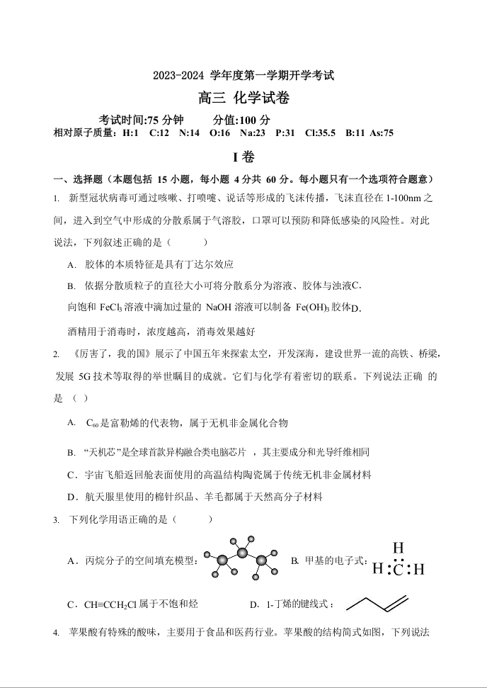 黑龙江省牡丹江市第三高级中学2024届高三上学期开学考试化学