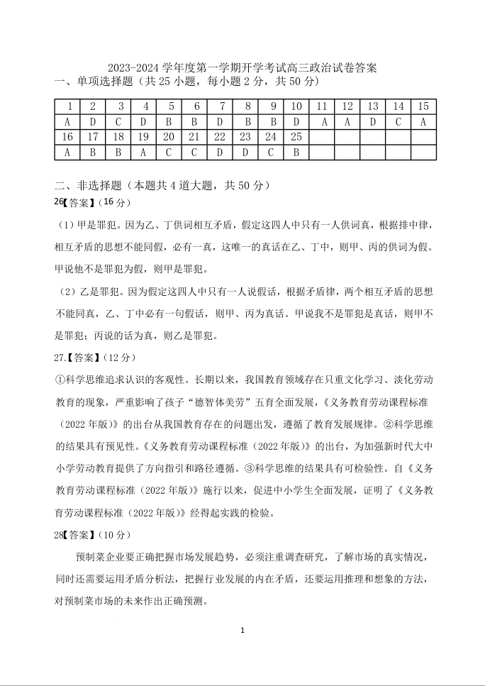 黑龙江省牡丹江市第三高级中学2024届高三上学期开学考试政治答案