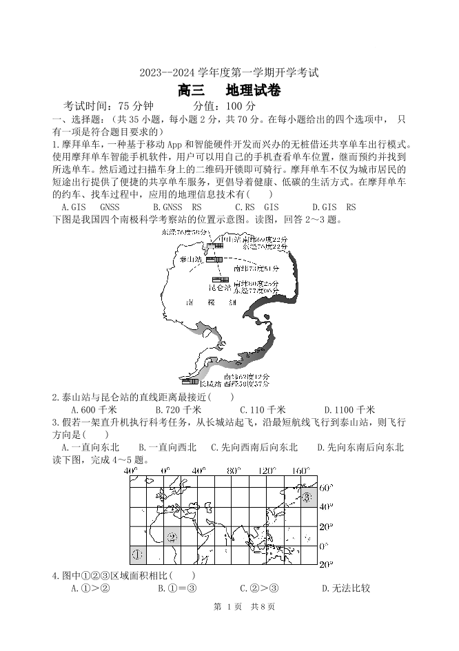 黑龙江省牡丹江市第三高级中学2024届高三上学期开学考试地理