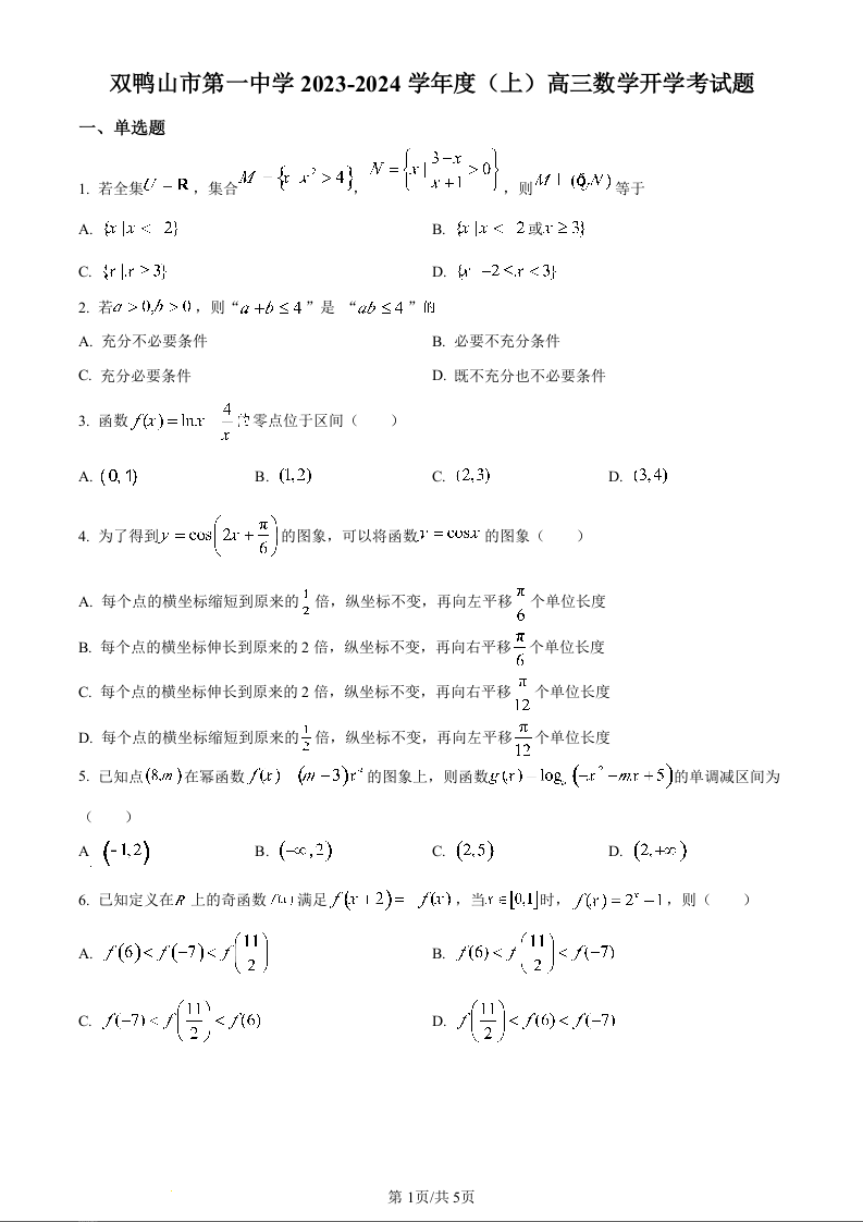黑龙江省双鸭山市第一中学2024届高三上学期开学考试数学(原卷版)