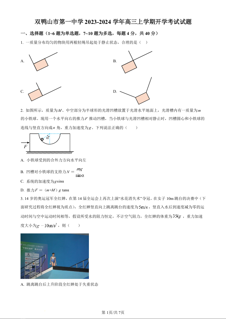 黑龙江省双鸭山市第一中学2024届高三上学期开学考试物理(原卷版)