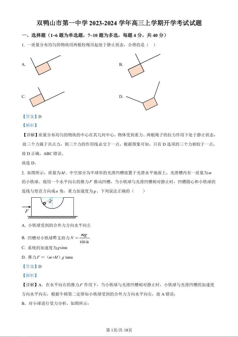 黑龙江省双鸭山市第一中学2024届高三上学期开学考试物理(精品解析版)