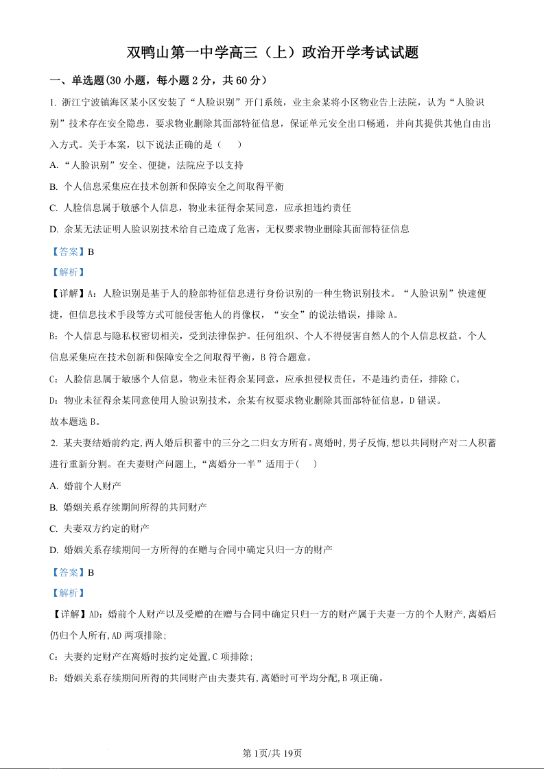 黑龙江省双鸭山市第一中学2024届高三上学期开学考试政治(精品解析版)