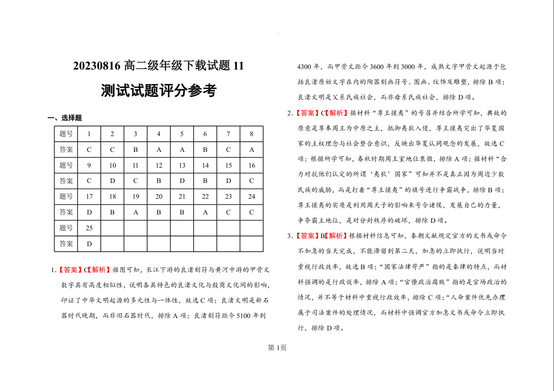 黑龙江省双鸭山市第一中学2024届高三上学期开学考试历史答案