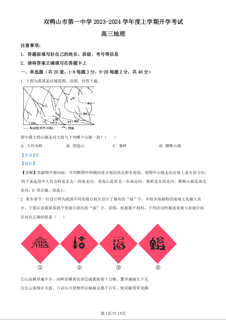 黑龙江省双鸭山市第一中学2024届高三上学期开学考试地理(精品解析版)