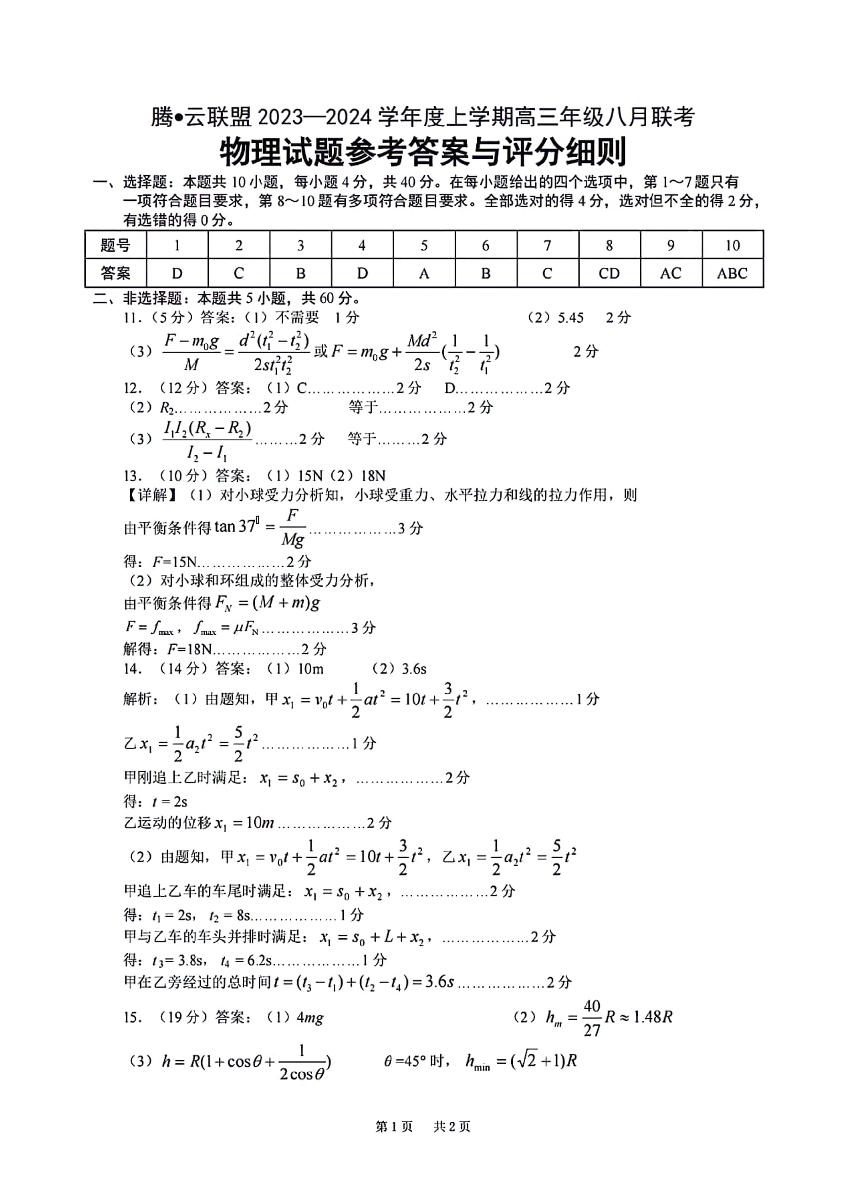 湖北省腾云联盟2024届高三上学期8月联考物理答案