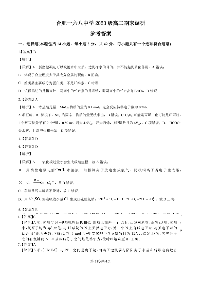 高二化学答案--安徽省合肥市合肥一六八中学2024-2025学年高二下学期期末考试